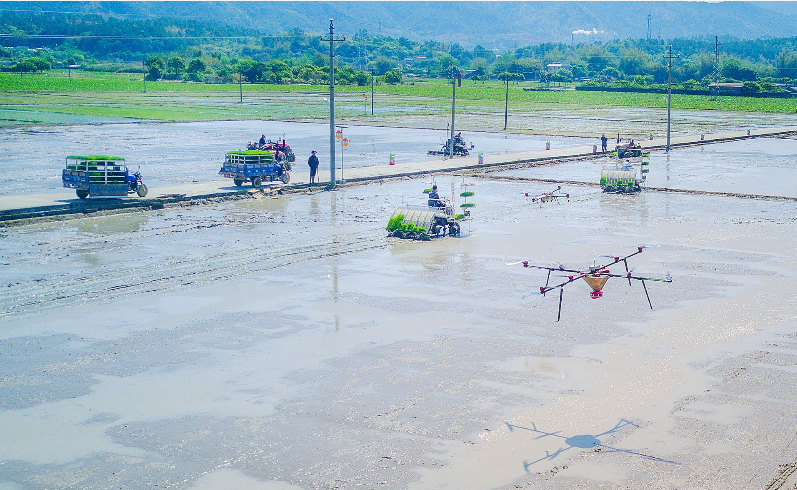 植保无人机和插秧机等新型农机正在蕉岭县长潭镇白马村的田间来回进行春耕作业。(连志城 摄)