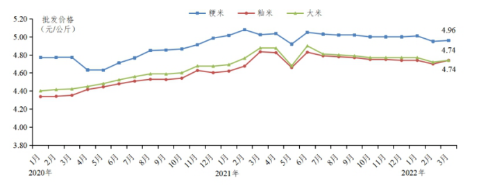 批发市场大米价格下降。市场需求减少,价格整体下滑。据省农业信息监测体系数据,第一季度主要批发市场大米批发均价为4.74元/公斤,环比、同比均下降0.6%。其中籼米批发价为4.73元/公斤,环比、同比均下降0.4%;粳米批发价格为4.98元/公斤,环比下降0.4%,同比下降1.0%。