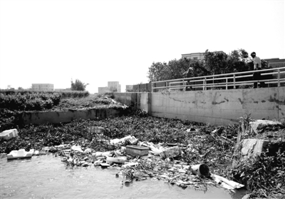 横跨的渡水槽被大量水浮莲及垃圾堵塞,上游来水难以排泄出去。 本报记者 李忠 摄