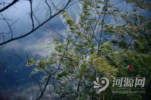 昨日下午,河源市市气象台测得和平县上陵镇已录得全市最低气温0.3℃。下午5时许,记者登上河源市和平上陵镇增公村海拔700多米的蛤蟆嶂主峰,看到落在树上的雨滴已结冰。据市气象台预测,今晚下半夜,河源市市北部部分地区有雨夹雪,最低气温将出现在25日早晨,最低气温-4℃到-2℃。