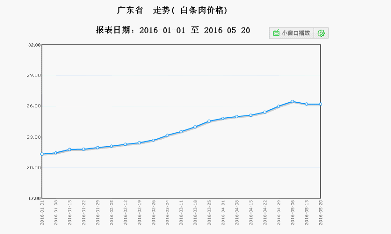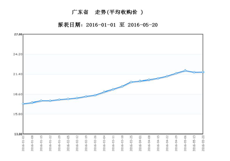 据对全省101家规模以上生猪定点屠宰样本企业监测统计,2016年5月16-22日,生猪平均收购价格为21.71元/公斤,较前一周上涨0.09%,较去年同期上涨42.17%,涨幅较大的地区有韶关市2.04%,阳江市1.94%,佛山市1.5%;白条肉平均出厂价格为26.19元/公斤,与前一周持平,较去年同期上涨36.76%。(畜禽屠宰管理处供稿)