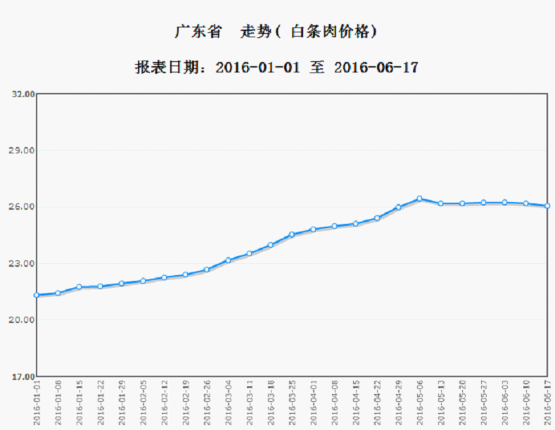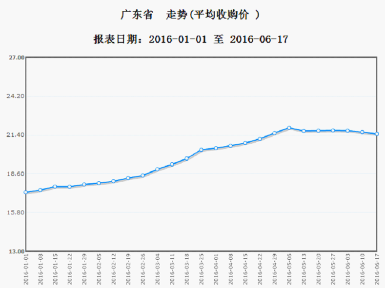 据对全省101家规模以上生猪定点屠宰样本企业监测统计,2016年6月13-19日,生猪平均收购价格为21.48元/公斤,较前一周下降0.6%,较去年同期上涨36.99%。本周较上周环比降幅较大的地区有潮州市3.57%,肇庆市3.46%,珠海市1.82%。