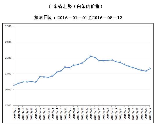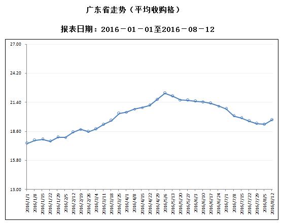 据对全省53家规模以上生猪定点屠宰样本企业监测统计,2016年8月8-14日,生猪平均收购价格为19.71元/公斤,较前一周上涨2.28%,较去年同期上升0.46%。本周较上周环比涨幅较大的地区有梅州市6.15%,广州市5.79%,珠海市5.32%。