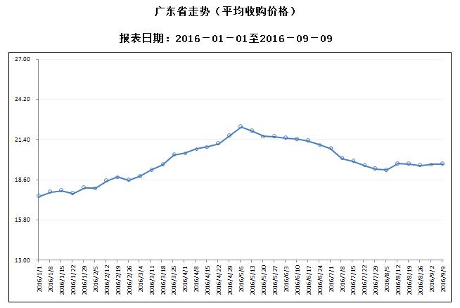 据对全省53家规模以上生猪定点屠宰样本企业监测统计,2016年9月5-11日,生猪平均收购价格为19.70元/公斤,较前一周上涨0.15%,较去年同期上涨2.87%。本周较上周环比涨幅较大的地区有珠海市2.59%,深圳市1.01%,中山市1%。