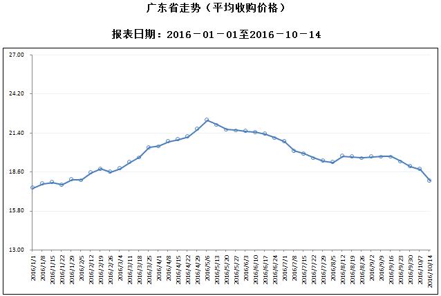 据对全省53家规模以上生猪定点屠宰样本企业监测统计,2016年10月10-16日,生猪平均收购价格为17.95元/公斤,较前一周下降4.37%,较去年同期下降0.77%。本周较上周环比降幅较大的地区有广州市10.75%,韶关市9.16%,中山市6.86%。