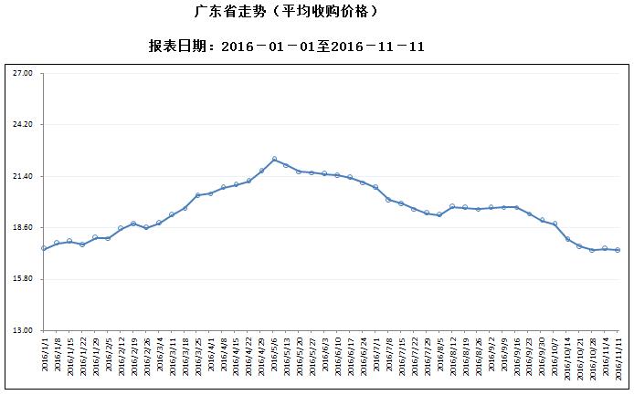 据对全省53家规模以上生猪定点屠宰样本企业监测统计,2016年11月7-13日,生猪平均收购价格为17.35元/公斤,较前一周下降0.52%,较去年同期上涨2.00%。本周较上周环比降幅较大的地区有中山市2.52%,珠海市2.41%,惠州市2.05%。