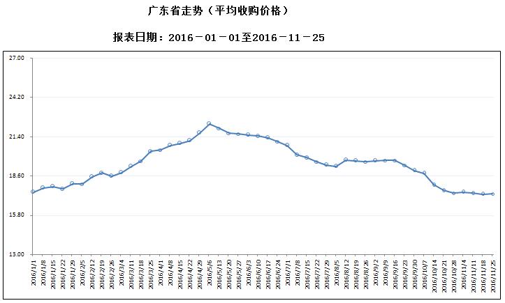据对全省53家规模以上生猪定点屠宰样本企业监测统计,2016年11月21-27日,生猪平均收购价格为17.32元/公斤,较前一周上涨0.23%,较去年同期上涨1.11%。本周较上周环比涨幅较大的地区有韶关市1.98%,汕头市1.30%,茂名市0.92%。