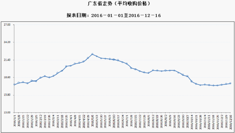 据对全省53家规模以上生猪定点屠宰样本企业监测统计,2016年12月12-18日,生猪平均收购价格为17.62元/公斤,较前一周上涨0.46%,较去年同期下降0.62%。本周较上周环比涨幅较大的地区有梅州市3.37%,潮州市3.29%,汕头市2.25%。