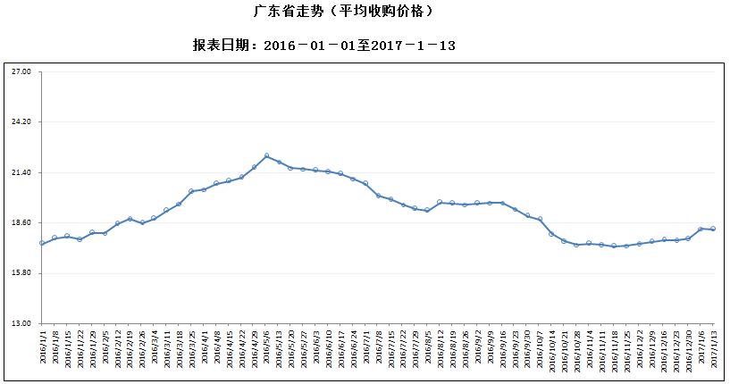 据对全省53家规模以上生猪定点屠宰样本企业监测统计,2017年1月9-15日,生猪平均收购价格为18.24元/公斤,较前一周下降0.11%,较去年同期上涨2.30%。本周较上周环比降幅较大的地区有湛江市4.78%,肇庆市3.24%,中山市1.77%。