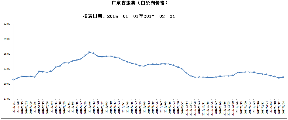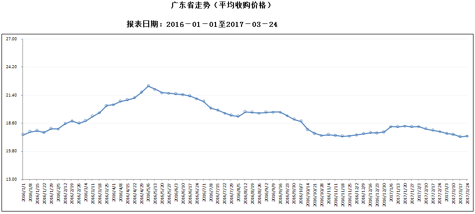 据对全省53家规模以上生猪定点屠宰样本企业监测统计,2017年3月20-26日,生猪平均收购价格为17.32元/公斤,较前一周上涨0.46%,较去年同期下降14.81%。本周较上周环比涨幅较大的地区有韶关市6.52%,珠海市3.73%,梅州市2.56%,但仍有10个市呈下降态势,其中河源、中山、广州、湛江、深圳、揭阳降幅均超过1%。