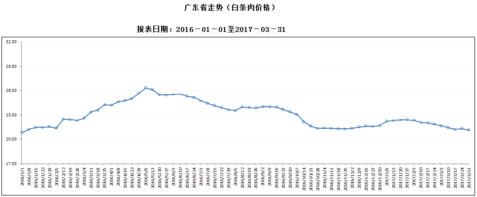 白条肉平均出厂价格为21.14元/公斤,较前一周下降0.80%,较去年同期下降12.57%。本周较上周环比降幅较大的地区有韶关市2.79%,佛山市1.94%,揭阳市和汕尾市1.86%,但仍有4个市呈上涨态势。(畜禽屠宰管理处 )
