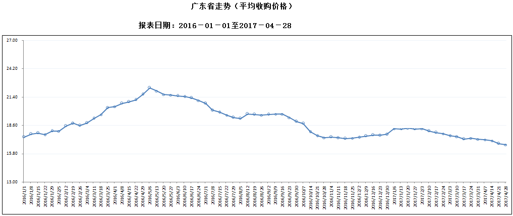据对全省53家规模以上生猪定点屠宰样本企业监测统计,2017年4月22-28日,生猪平均收购价格为16.67元/公斤,较前一周下降0.71%,较去年同期下降23.04%。本周较上周环比降幅较大的地区有广州市2.93%,深圳市2.39%,茂名市2.33%,但仍有5个市呈上涨态势,其中肇庆涨幅超1%。