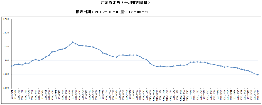 据对全省53家规模以上生猪定点屠宰样本企业监测统计,2017年5月20-26日,生猪平均收购价格为15.66元/公斤,较前一周下降1.45%,较去年同期下降27.47%。本周较上周环比降幅较大的地区有汕头市5.33%,珠海市5.19%,中山市4.16%,但仍有4个市呈上涨态势,其中河源和梅州涨幅均超1%。