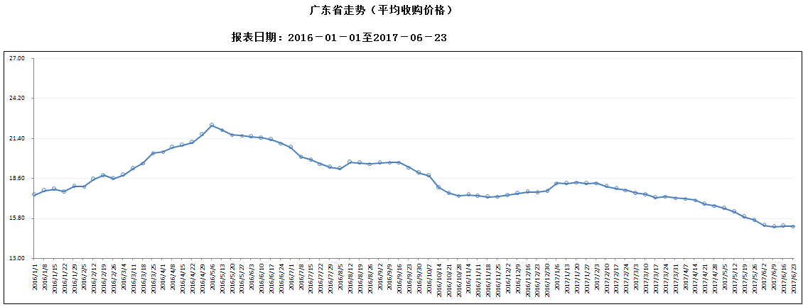 据对全省53家规模以上生猪定点屠宰样本企业监测统计,2017年6月17-23日,生猪平均收购价格为15.23元/公斤,较前一周下降0.07%,较去年同期下降27.06%。本周较上周环比降幅较大的地区有珠海市2.78%,湛江市1.71%,梅州市1.61%,但仍有10个市呈上涨态势,其中深圳涨幅超过2%。