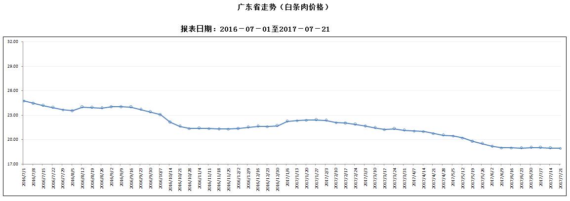 白条肉平均出厂价格为18.93元/公斤,较前一周下降0.11%,较去年同期下降21.09%。本周较上周环比降幅较大的地区有揭阳市2.99%,韶关市0.75%,清远市0.65%,但仍有6个市呈上涨态势,其中湛江涨幅超过2%。(畜禽屠宰管理处 )