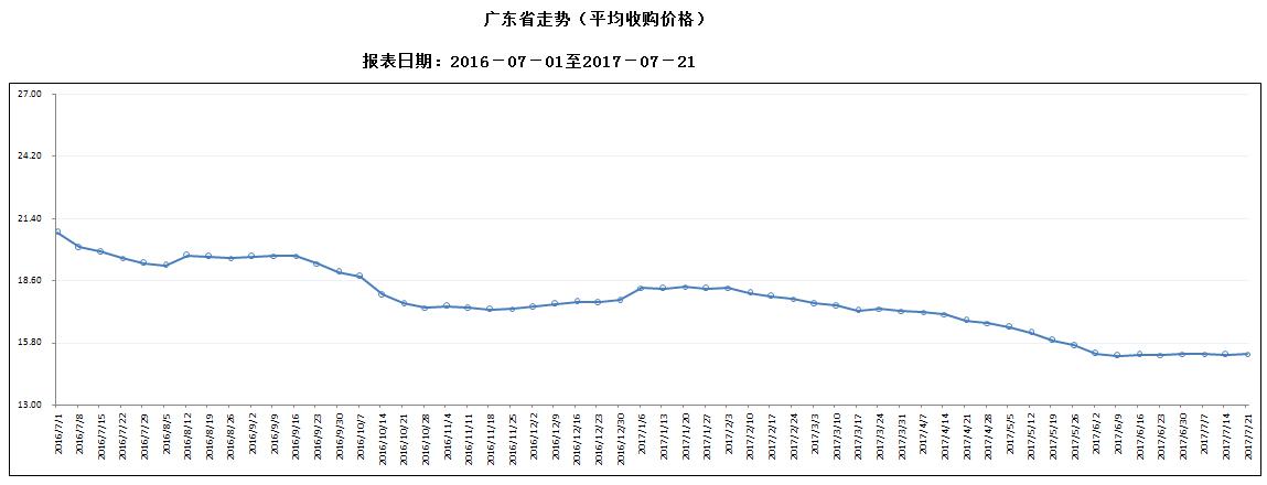 据对全省53家规模以上生猪定点屠宰样本企业监测统计,2017年7月15-21日,生猪平均收购价格为15.28元/公斤,较前一周上涨0.20%,较去年同期下降22.04%。本周较上周环比涨幅较大的地区有湛江市1.86%,珠海市1.38%,揭阳市1.08,但仍有7个市呈下降态势。