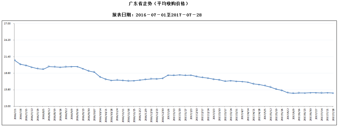 据对全省53家规模以上生猪定点屠宰样本企业监测统计,2017年7月22-28日,生猪平均收购价格为15.23元/公斤,较前一周下降0.33%,较去年同期下降21.09%。本周较上周环比降幅较大的地区有中山市3.28%,肇庆市1.79%,汕尾市0.84%,但仍有6个市呈上涨态势。