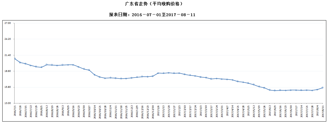 据对全省53家规模以上生猪定点屠宰样本企业监测统计,2017年8月5-11日,生猪平均收购价格为15.70元/公斤,较前一周上涨2.15%,较去年同期下降20.30%。本周较上周环比涨幅较大的地区有中山市5.70%,潮州市5.20%,汕头市4.16%,但仍有2个市呈下降态势。