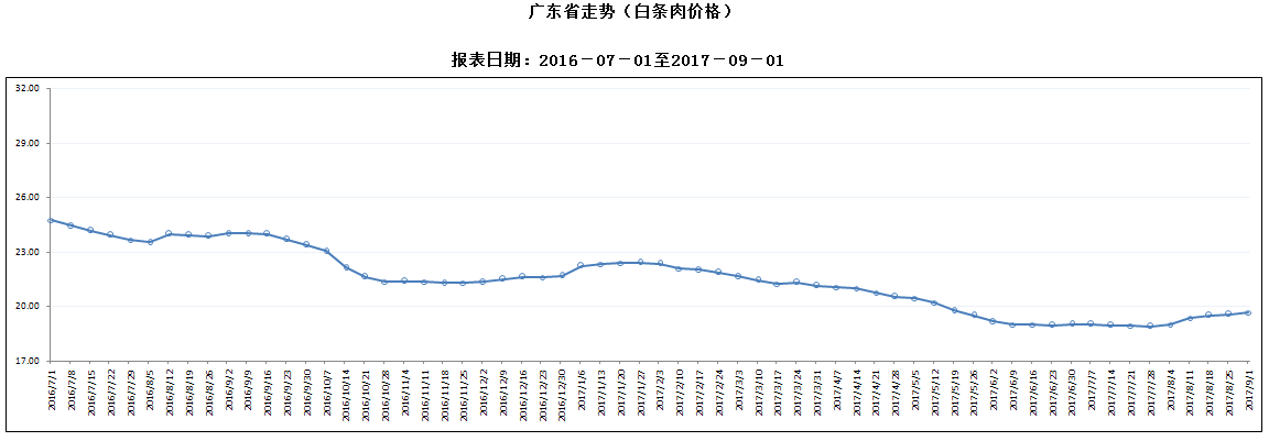据对全省53家规模以上生猪定点屠宰样本企业监测统计,2017年8月26-9月1日,生猪平均收购价格为16.01元/公斤,较前一周上涨0.50%,较去年同期下降18.52%。本周较上周环比涨幅较大的地区有云浮市3.31%,清远市2.44%,深圳市2.02%,但仍有4个市呈下降态势,降幅均超过1%。