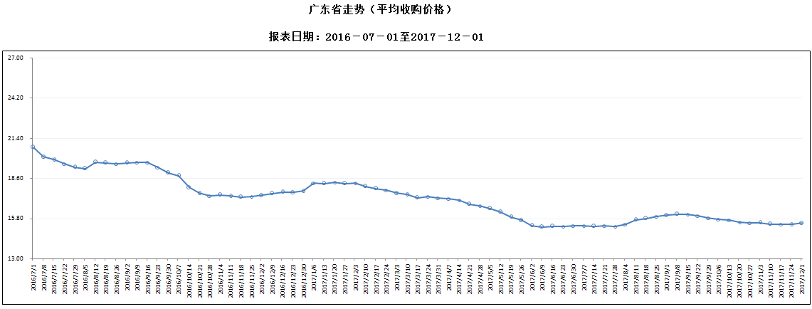 据对全省53家规模以上生猪定点屠宰样本企业监测统计,2017年11月25-12月1日,生猪平均收购价格为15.46元/公斤,较前一周上涨0.65%,较去年同期下降11.15%。本周较上周环比涨幅较大的地区有肇庆市2.65%,湛江市2.53%,韶关市2.31%,但仍有3个市呈下降态势,其中江门降幅超过2%。