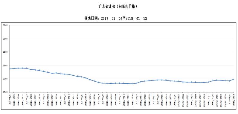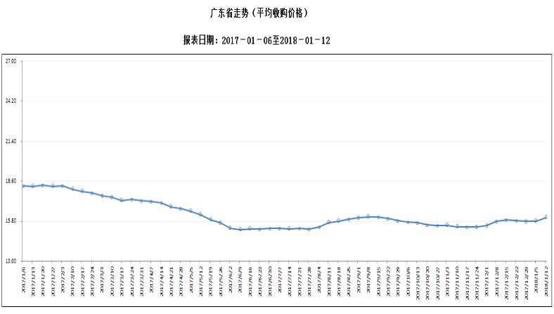 据对全省53家规模以上生猪定点屠宰样本企业监测统计,2018年1月6-12日,生猪平均收购价格为16.05元/公斤,较前一周上涨1.58%,较去年同期下降12.05%。本周较上周环比涨幅较大的地区有韶关市4.53%,清远市4.35%,潮州市3.23%,但深圳、茂名和东莞3个市仍呈下降态势,且降幅都超过1%。
