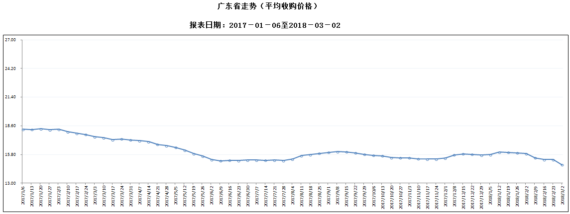据对全省53家规模以上生猪定点屠宰样本企业监测统计,2018年2月24-3月2日,生猪平均收购价格为14.81元/公斤,较前一周下降3.20%,较去年同期下降15.61%。本周较上周环比降幅较大的地区有珠海市5.41%,阳江市5.32%,肇庆市4.98%,但梅州市仍呈上涨态势,涨幅超过1%。