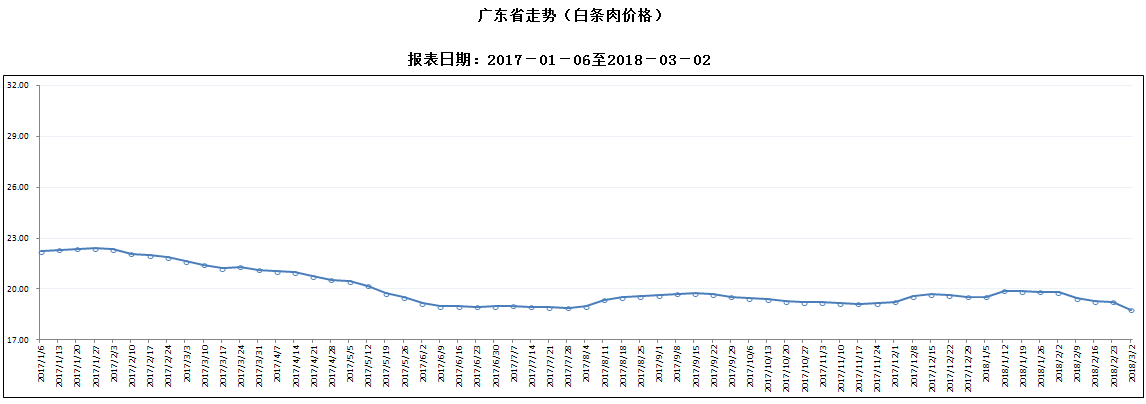 白条肉平均出厂价格为18.77元/公斤,较前一周下降2.49%,较去年同期下降13.22%。本周较上周环比降幅较大的地区有阳江市5.57%,珠海市5.26%,中山市4.34%,但仍有3个市呈上涨态势,其中梅州涨幅超过1%。(畜禽屠宰管理处)