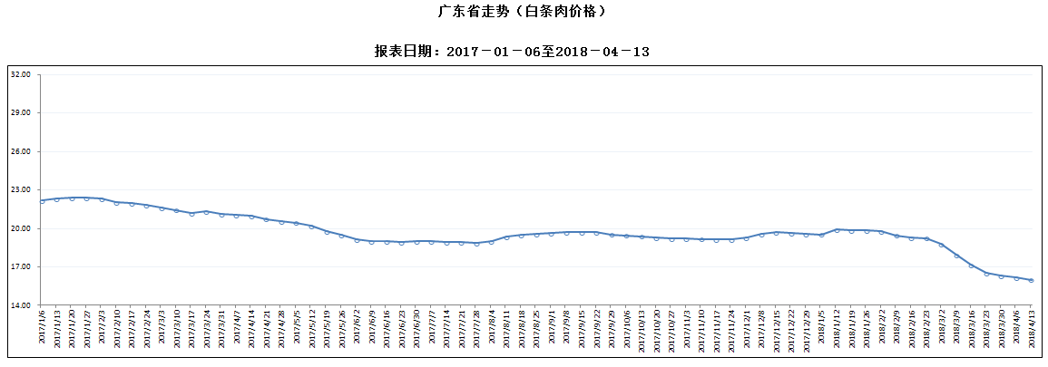 据对全省53家规模以上生猪定点屠宰样本企业监测统计,2018年4月7-13日,生猪平均收购价格为12.40元/公斤,较前一周下降1.35%,较去年同期下降27.36%。本周较上周环比降幅较大的地区有广州市6.77%,汕头市3.72%,深圳市3.53%,但仍有5个市呈上涨态势,其中珠海涨幅超过1%。