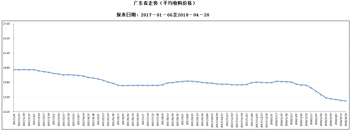 据对全省53家规模以上生猪定点屠宰样本企业监测统计,2018年4月14-20日,生猪平均收购价格为12.31元/公斤,较前一周下降0.73%,较去年同期下降26.68%。本周较上周环比降幅较大的地区有深圳市7.33%,清远市4.15%,东莞市4.14%,但仍有4个市呈上涨态势,其中汕头涨幅超过1%。