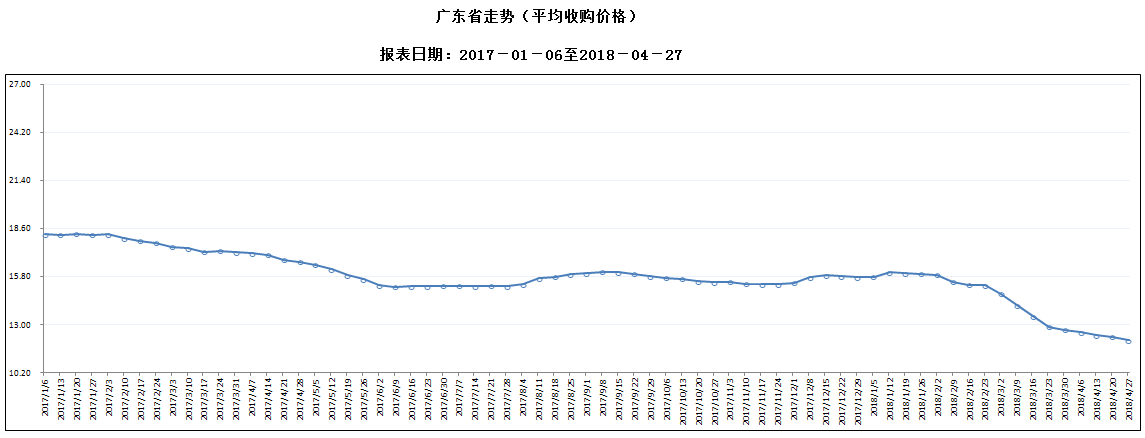 据对全省53家规模以上生猪定点屠宰样本企业监测统计,2018年4月21-27日,生猪平均收购价格为12.10元/公斤,较前一周下降1.71%,较去年同期下降27.41%。本周较上周环比降幅较大的地区有深圳市6.32%,清远市5.75%,梅州市5.26%,但仍有2个市呈上涨态势。