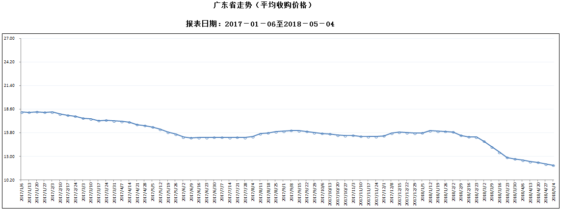 据对全省53家规模以上生猪定点屠宰样本企业监测统计,2018年4月28-5月4日,生猪平均收购价格为11.95元/公斤,较前一周下降1.24%,较去年同期下降27.58%。本周较上周环比降幅较大的地区有清远市5.84%,深圳市5.49%,湛江市3.41%,但仍有3个市呈上涨态势,其中梅州涨幅超过3%。