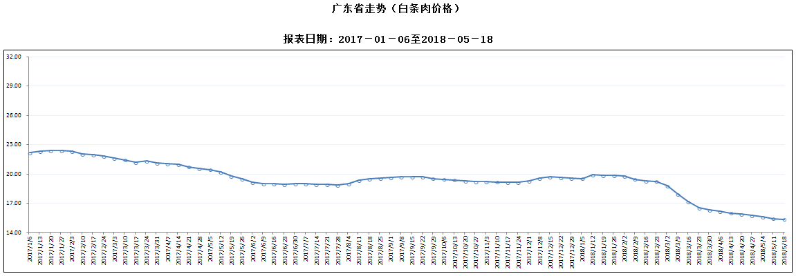 据对全省53家规模以上生猪定点屠宰样本企业监测统计,2018年5月12-18日,生猪平均收购价格为11.69元/公斤,较前一周下降0.93%,较去年同期下降26.43%。本周较上周环比降幅较大的地区有湛江市3.39%,汕头市2.64%,惠州市2.02%,但仍有3个市呈上涨态势。