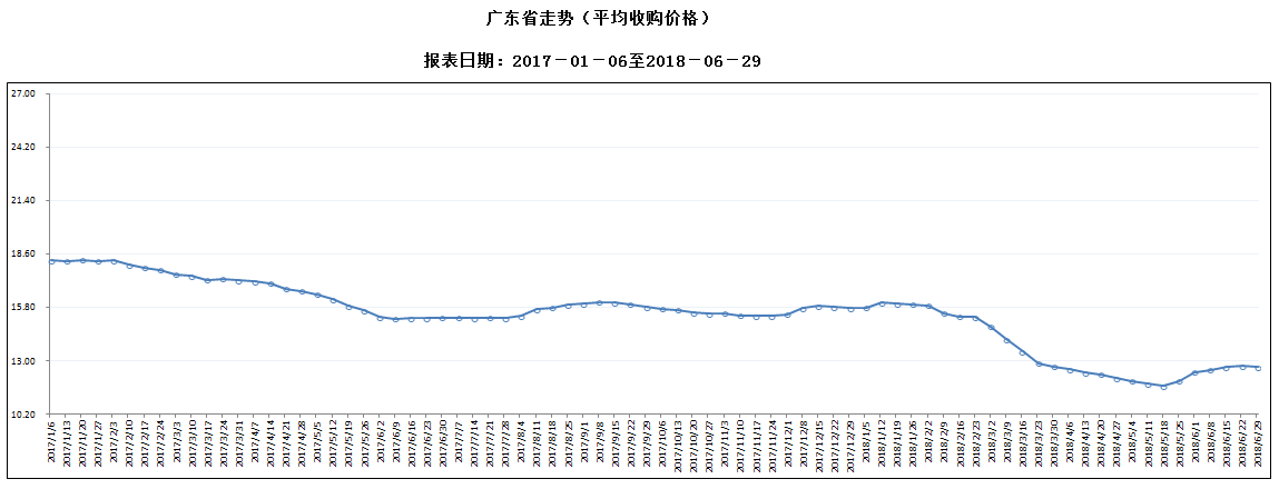 据对全省53家规模以上生猪定点屠宰样本企业监测统计,2018年6月23-29日,生猪平均收购价格为12.68元/公斤,较前一周下降0.55%,较去年同期下降17.07%。本周较上周环比降幅较大的地区有珠海市3.08%,佛山市1.96%,江门市1.54%,但仍有7个市呈上涨态势,其中肇庆涨幅超过2%。