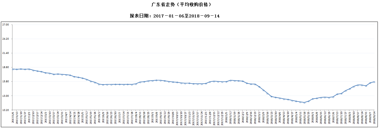 据对全省53家规模以上生猪定点屠宰样本企业监测统计,2018年9月8-14日,生猪平均收购价格为15.77元/公斤,较前一周上涨1.28%,较去年同期下降1.87%。本周较上周环比涨幅较大的地区有惠州市5.71%,汕头市4.79%,梅州市3.64%,但有5个市呈下降态势,其中东莞降幅超过4%。