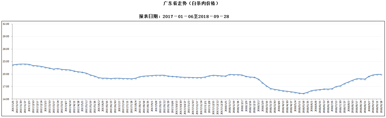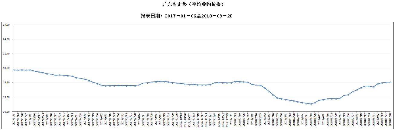 据对全省53家规模以上生猪定点屠宰样本企业监测统计,2018年9月22-28日,生猪平均收购价格为15.92元/公斤,较前一周上涨0.19%,较去年同期上涨0.63%。本周较上周环比涨幅较大的地区有阳江市2.64%,中山市2.59%,广州市2.58%,但有11个市呈下降态势,其中揭阳降幅超过2%。