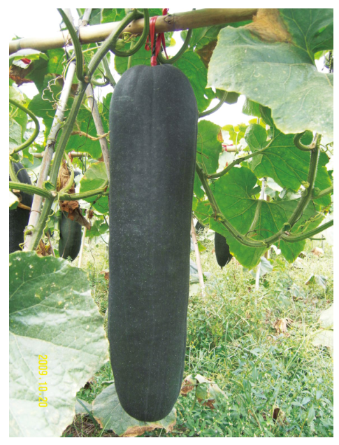 特征特性:生长势旺, 中晚熟, 坐瓜能力强, 瓜形一致, 匀称,皮色墨绿,浅棱沟,平均单瓜长 81.3cm,横径约 19.7cm,肉厚6.5cm,肉质致密,致密性为 1.944g/cm3,囊腔小,平均单瓜重13.2kg,可溶性固形物含量约 3.68%。田间表现抗枯萎病、中抗疫病、病毒病。春季从播种至收获 120 天,秋季从播种至收获100 天。