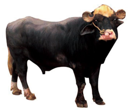 特征特性 : 该牛角短、基部宽广 ,脸较长 ,前额突出,玉石眼(虹膜缺乏色素)。角基向后再朝上紧紧卷曲呈螺状。体躯深厚,躯架较低,体格粗壮,腹垂较大尾端达飞节以下,乳头特别粗大且长,乳静脉显露、弯曲。脸部、鼻端、四肢系部,有白斑块。繁殖力、育成率高、生长发育快、泌乳性能好、抗病力强、耐热、耐粗饲、易肥性情温顺,耐热,抗病力强。
