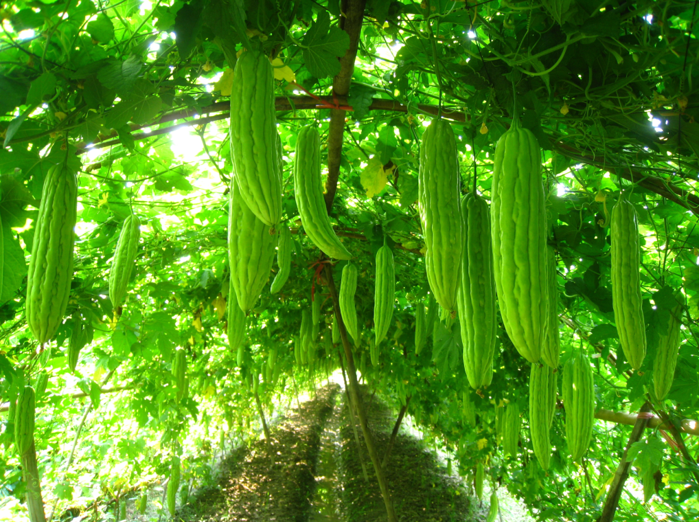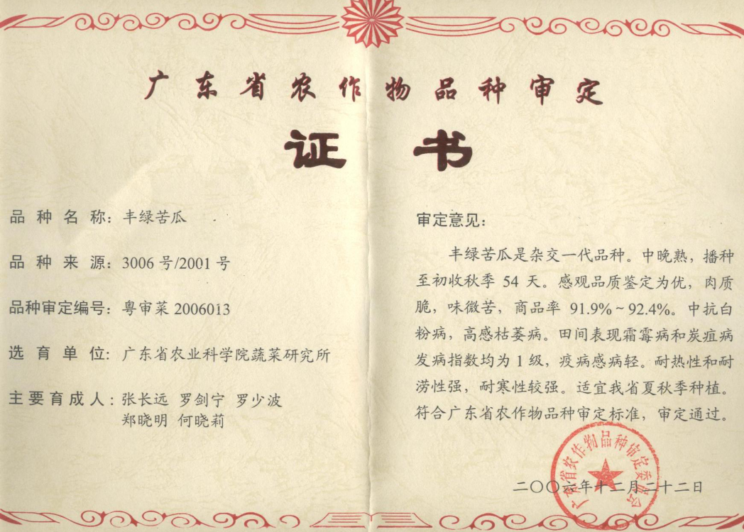 特征特性 杂交一代品种。中晚熟,播种至初收春季78天,秋季54天。植株生势和分枝性较强。瓜长圆锥形,皮色浅绿,条状瘤,瓜长23.7-26.1厘米,横径5.6-6.0厘米,肉厚约1.0厘米, 单瓜重292.6-347.7克;感官品质优,肉质脆,苦味淡;理化品质测定, 每100克鲜果含Vc157毫克,可溶性固形物2.18克,粗蛋白0.62克,粗纤维0.5克。抗病性鉴定为中抗白粉病,感枯萎病。田间表现霜霉病和炭疽病发病指数均为1级,疫病感病轻。耐热性和耐涝性强,耐寒性较强。