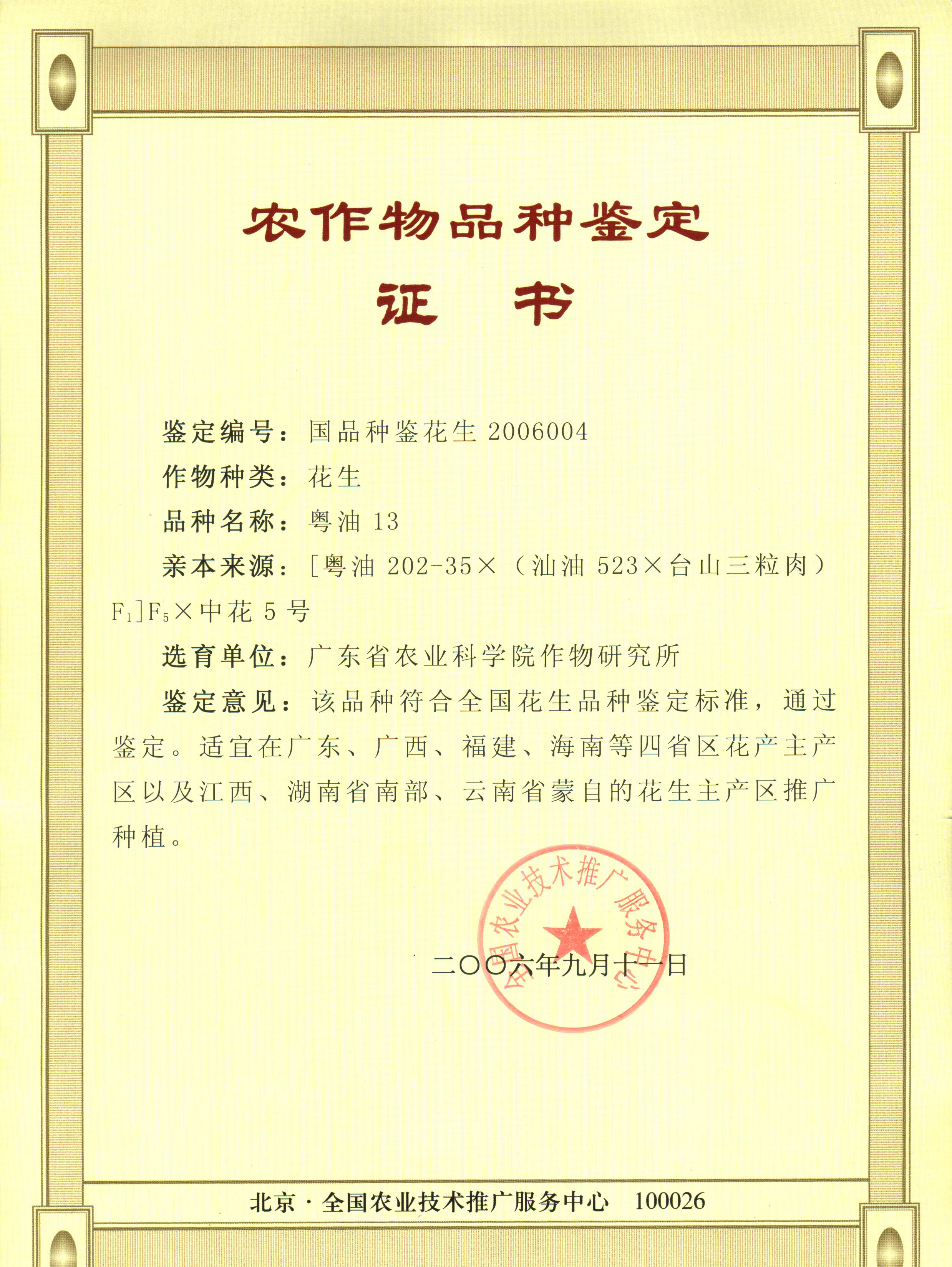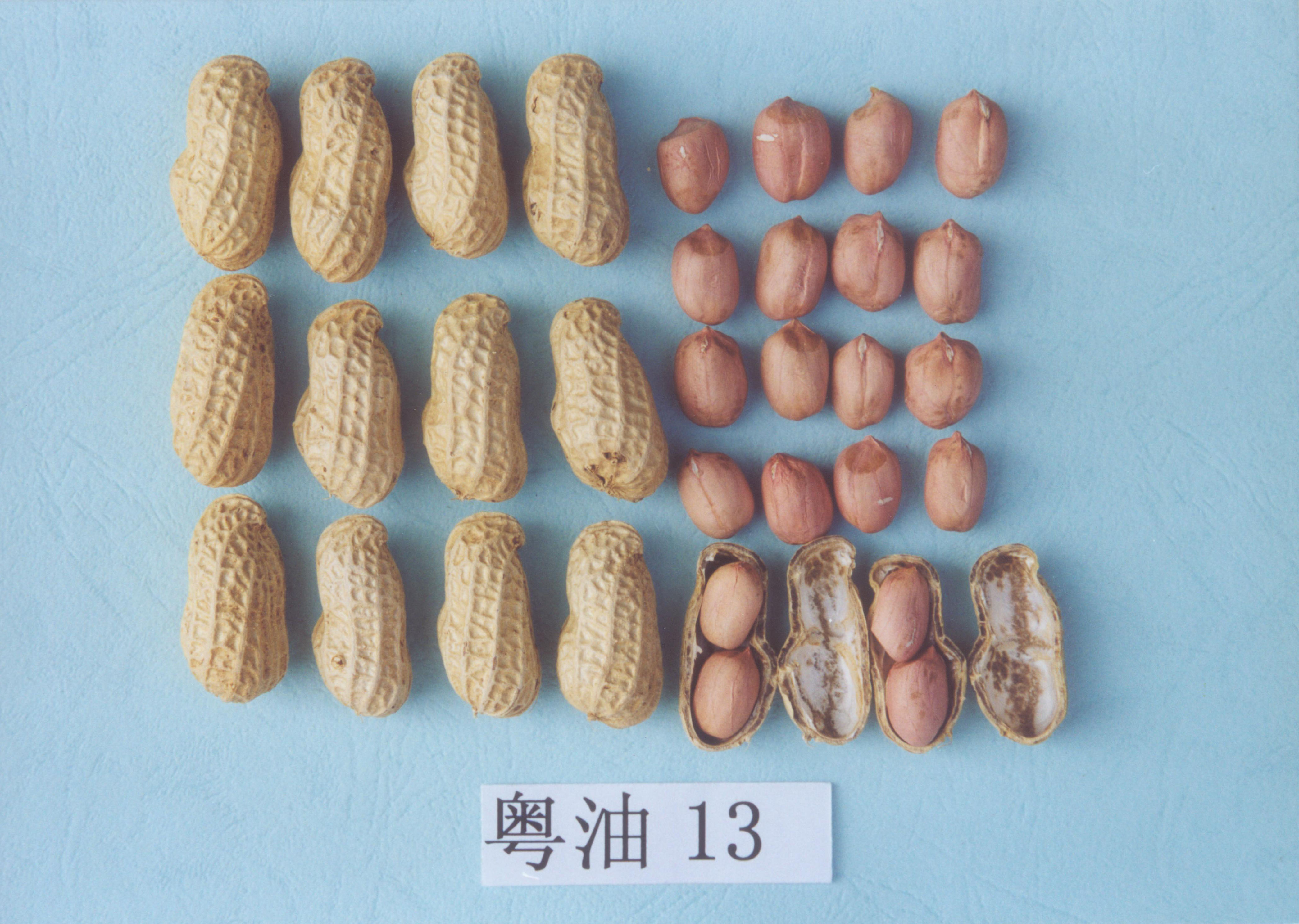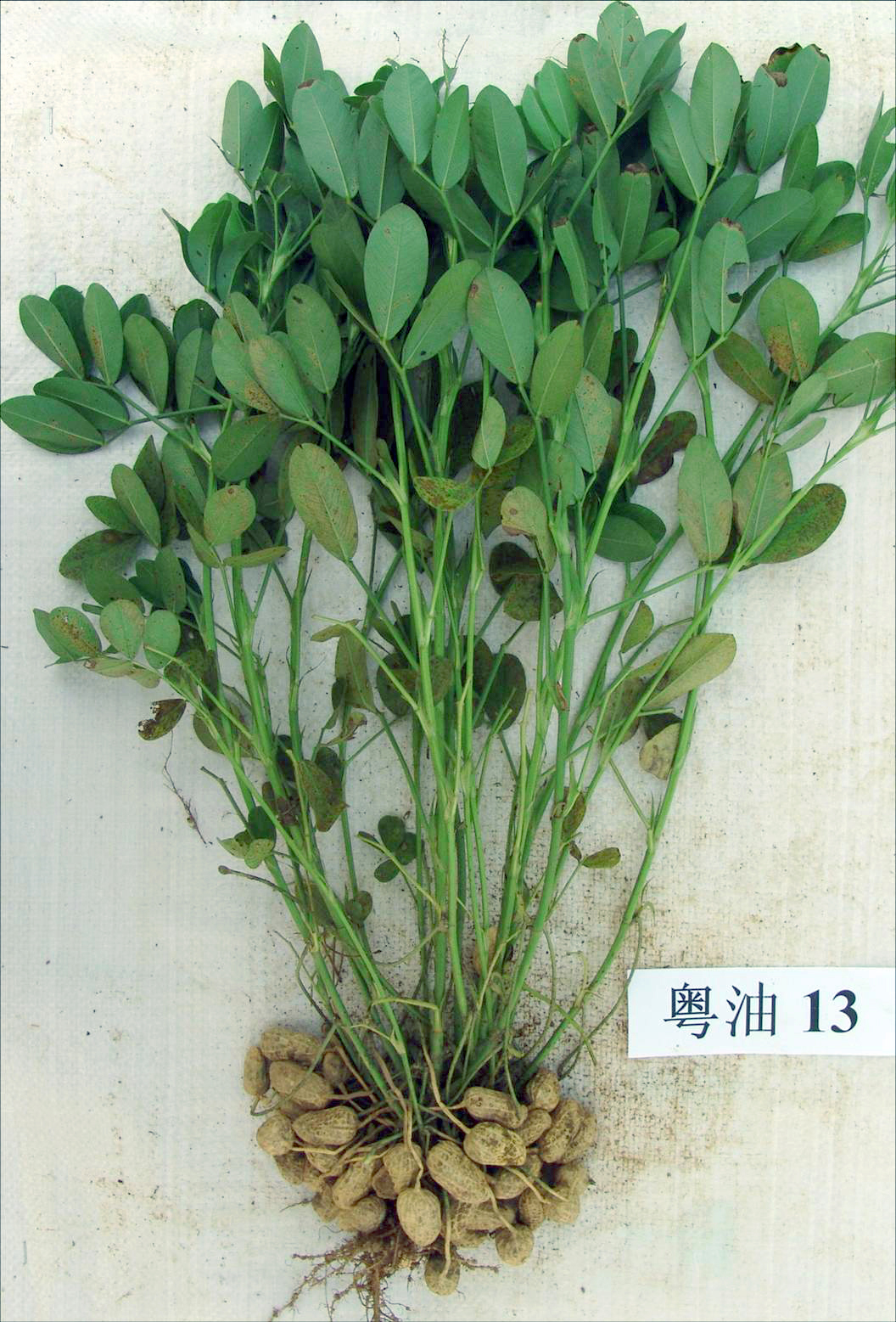 特征特性 “粤油13”属高产品种,一般亩产250-300公斤。该品种是直立珍珠豆型,连续开花,疏枝。该品种株高中等、生势强,株型紧凑,主茎高48.1厘米,分枝长51.7厘米,总分枝数6.9条,有效分枝5.1条,主茎叶数14.8片,收获时主茎青叶数6.7片,叶片大小中等,叶色深绿,抗倒性、耐旱性、耐涝性均较强。高抗叶斑病和锈病,叶斑病2.9级,锈病2.7级。单株果数16.7个,饱果率80.24%,双仁果率74.77%,荚果大,百果重193.2克,公斤果数622个,出仁率66.3%。含油率53.19%。全生育期128天。