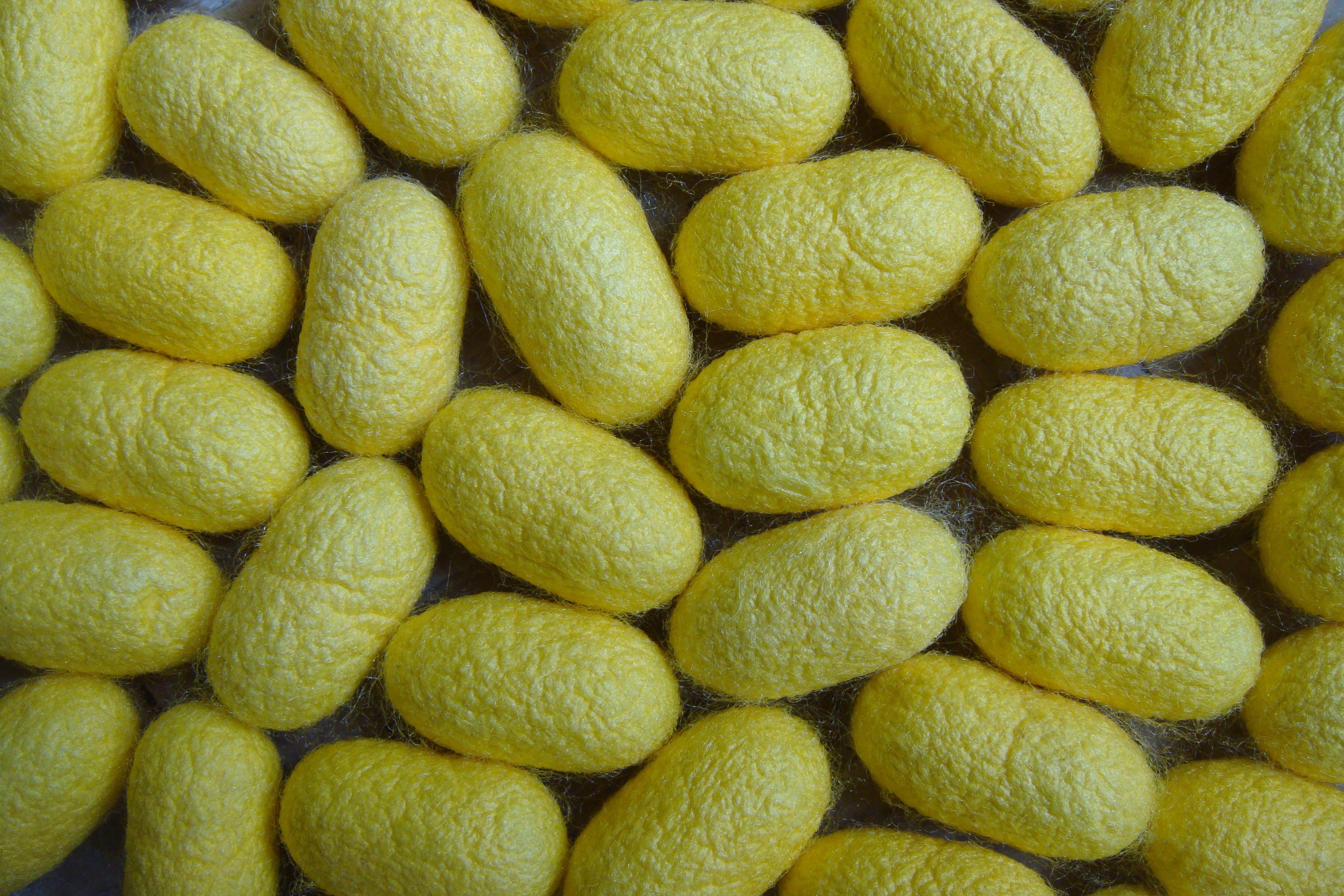 特征特性 粤蚕黄茧1号是中·中×日·日四元杂交种,二化、四眠。正交卵色褐色,卵壳淡黄色。反交卵色紫褐色,卵壳白色。蚁蚕黑褐色,克蚁头数2200-2300头,全龄经过20-21天。强健、好养,孵化眠起齐一,壮蚕体色黄白,素斑,体形粗壮,食桑快。熟蚕齐一,营茧快。茧形长椭圆,茧色金黄,缩皱中等,茧层结实。可开发高品位彩色丝绵。