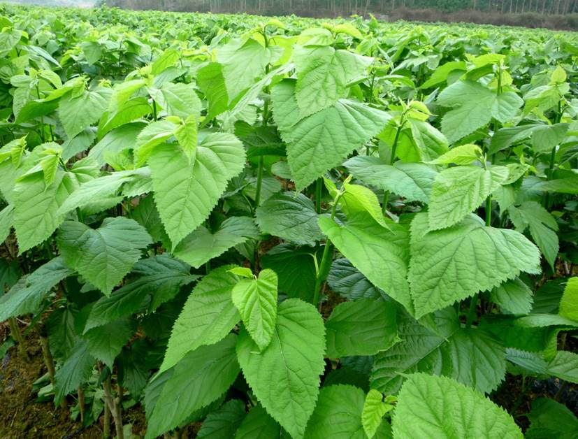 特征特性 树形稍开展,群体整齐。叶心形和长心形,具有发芽早、发条数多、长势旺盛、叶片成熟快、耐旱、适应性广、弱抗青枯病等特性。春季成熟叶片长25.0~30.0 cm,宽20.0~26.0 cm,平均单叶重8.0~10.5 g。盛产期亩桑产叶量3500~4200公斤,100公斤桑叶产茧量春季7.5~8.0公斤、秋季9.0~9.5公斤。叶片收获间隔25天左右,条桑收获间隔40~45天,不宜超过50天,掌握适熟偏嫩收获。桑叶产量高、质量好,适宜我省及长江以南地区种植。