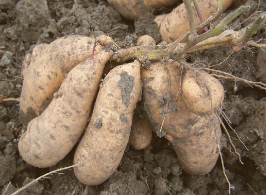特征特性:萌芽性中等,株型半直立,中长蔓,中等分枝,顶叶绿带紫边,叶形心齿形,叶脉、茎绿色,结薯集中,单株结薯数中等,薯形下膨,薯皮黄色,薯肉桔红色,薯身光滑、美观,薯块大小均匀,耐贮性较好。平均干物率28.11%,食味76.8分,淀粉率17.29%,胡萝卜素含量12.82毫克/100克鲜薯。中抗薯瘟病。适应性广。区试鲜薯、干薯平均亩产分别为2400公斤左右、670公斤左右。