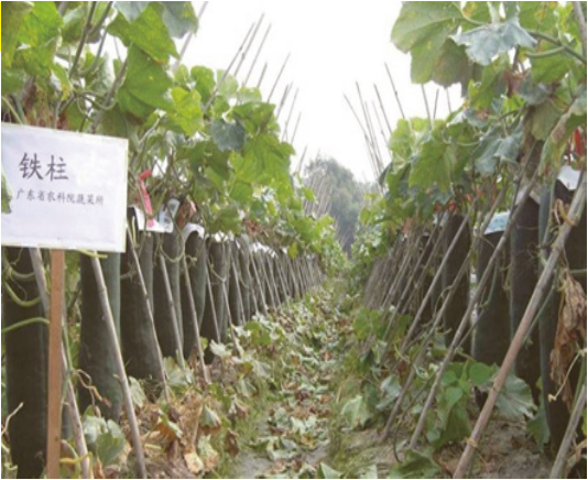 特征特性:生长势旺,中晚熟,坐瓜能力强,瓜形一致,匀称,皮色墨绿,浅棱沟,平均单瓜长81.3cm,横径约19.7cm,肉厚6.5cm,肉质致密,致密性为1.944g/cm3,囊腔小,平均单瓜重13.2kg,可溶性固形物含量约3.68%。田间表现抗枯萎病、中抗疫病、病毒病。春季从播种至收获120天,秋季从播种至收获100天。区试平均亩产6000公斤左右。