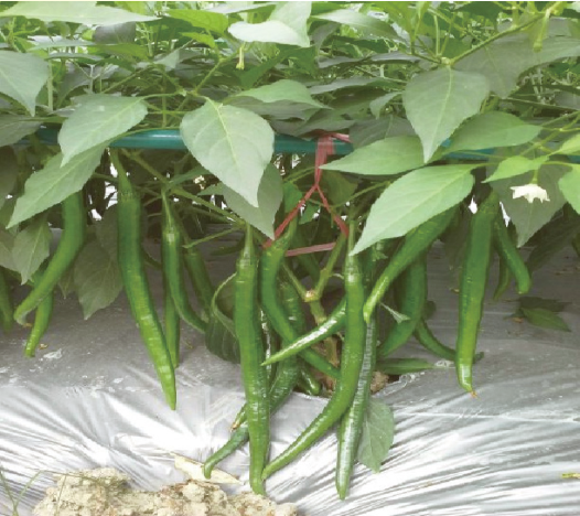 特征特性:植株长势旺盛,叶色绿,早熟,株高60cm,开展度50cm,叶片小,株型直立向上,果实为深绿长线椒,果长23-28cm,宽1.7 cm左右,单果重25-35克。青熟果深绿色,红果鲜艳,挂果多,味辣且香,风味佳,商品性特佳,适应性广,连续采收期长,后劲足,耐热性和耐寒性强,田间表现抗病毒病和炭疽病能力强。平均亩产1000公斤左右。