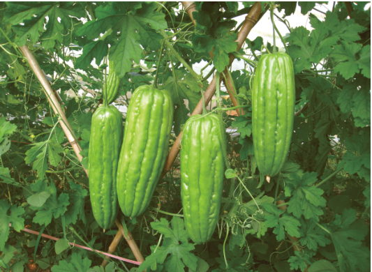 特征特性:杂交一代品种。植株生长势和分枝性强,叶片绿色。从播种至始收春季75天、秋季51天,延续采收期春季33天、秋季36天,全生育期春季108天、秋季87天。第一朵雌花着生节位15.6-19.4节,第一个瓜座瓜节位17.1-22.5节。瓜长圆锥形,瓜皮绿色,条瘤。瓜长23.6~24.8厘米,横径5.89-6.02厘米,肉厚1.01-1.02厘米。单瓜重308.5-353.8克,单株产量1.39~2.12公斤,商品率92.43%-92.95%。品质好,感观品质鉴定为优,品质分86分。理化品质检测结果:粗纤维含量0.81%,可溶性固形物含量2.7%,维生素C含量95.9毫克/100克,粗蛋白含量1.01%。抗病性接种鉴定为抗白粉病、感枯萎病。田间表现耐热性和耐旱性强,耐涝性中等。平均亩产4500公斤左右。