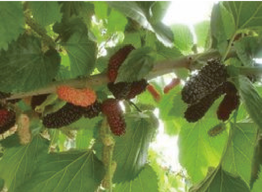 特征特性:树形稍开展,发条数多,座果率92%-96%,成熟果黑紫色,无籽,口感风味佳,圆筒形,长径2.5cm-6.5cm,横径1.0cm-2.0cm,盛产期亩产鲜果1500~2000kg,鲜榨果汁糖度9.0%~16.0%;叶心脏形,叶长22.0cm,叶幅18.3cm,亩产桑叶1500 kg,100公斤桑叶产茧量6.5~8.0公斤。可果叶两用开发。适宜华南地区及全国种植。近三年在我省及全国20多个省(区、市)种植230多万亩,盛产期年亩产鲜果1500 kg以上。