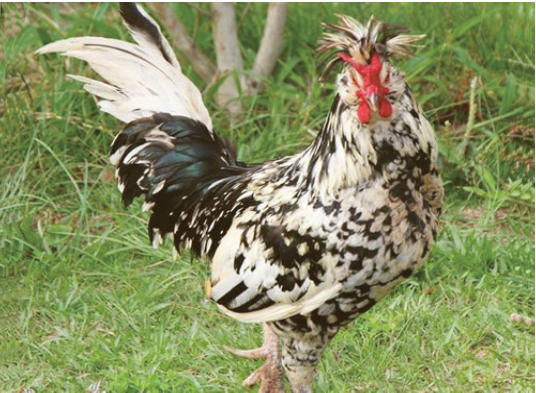 1、主要外貌特征:黑白花羽 ,头上着有华丽毛冠,头顶有三冠, 脚上有五爪,是禽类少有之特点,皮肤为粉白色,胫较细,粉白色上带有浅黑色斑点。