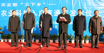 12月22日,农业部在京举行农业科技入户直通车发车仪式。杜青林部长向项目承担单位发放了钥匙,首批150辆科技入户直通车正式启动。