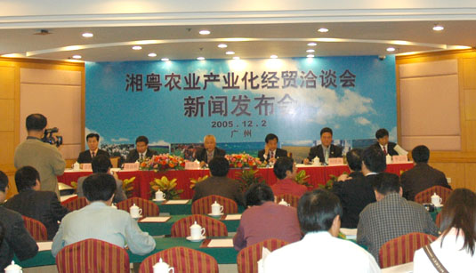 12月2日,湘粤两省农业部门共聚美丽羊城,联袂举行湘粤农业产业化经贸洽谈会新闻发布会。广东省农业厅潘嘉念副厅长 致欢迎辞并宣布:湘粤农业产业化经贸洽谈会将于2006年1月在长沙举行。