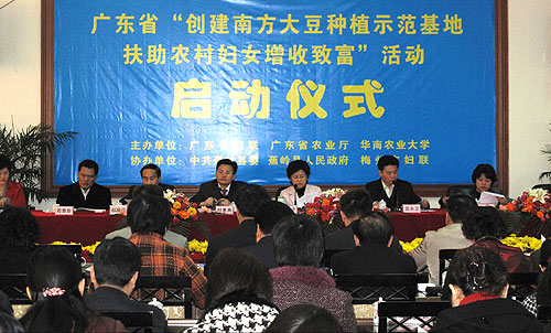 3月11日上午,广东省梅州市蕉岭县长潭镇神岗村彩旗飘飘、人头攒动,由省妇联、省农业厅、华南农业大学共同主办的广东省“创建南方大豆种植示范基地,扶助农村妇女增收致富”活动启动仪式隆重举行。省妇联、省农业厅、华南农业大学、省扶贫办相关领导,韶关、河源、梅州等9个地级市妇联和农业局领导以及梅州市100多人出席了会议。